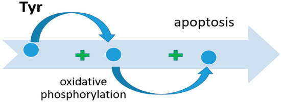 Tyr, like any other amino acid, is a building material for proteins on the one hand, and acts as an alternative source of energy for cell life on the other hand. The main site of Tyr metabolism is the liver. In it, the formation of precursors for gluconeogenesis and ketogenesis occurs, as well as the decomposition of amino acids into secondary metabolites with the participation of five key enzymes. Disturbances in Tyr metabolism lead to the occurrence of pathologies such as Huntington’s disease [72] or esophageal cancer [73,74]. Nguyen et al. conducted a comprehensive cross-platform data study to search for potential therapeutic and preventive biomarkers for hepatocellular carcinoma (HCC) [75]. They found a pathologically reduced level of expression of the genes tyrosine aminotransferase (TAT), heme-dependent peroxin (HDP), homogentisate-1,2-dioxygenase (HTG), Glutathione-S-transferase zeta 1 (GSTZ1), and fumarylacetoacetase (FAH), and a consequent decrease in the translation of these enzymes [76]. A positive correlation has been established between the levels of enzymes such as TAT, HTG, and GSTZ1 and the survival of patients with an established diagnosis of HCC. An explanation for the positive prognosis associated with TAT is given in a study by Fu et al. [77]. The proapoptotic effect of tyrosine aminotransferase was experimentally demonstrated by comparing two cell cultures, one of which was transfected with TAT; the other was transfected with an empty vector. The apoptosis index was assessed before and after treatment with straurosporine. The apoptosis index was higher in cell culture with the TAT vector. The proapoptotic effect was due to changes in mitochondrial membrane potential. The mechanism of apoptosis was triggered as follows: the mitochondrial permeability of the cell increased, which led to an increase in the release of Cytochrome-C into the cytoplasm. Cytochrome-C changed the conformation of Apaf-1, initiating apoptosis through activation of caspase-9, which activated caspase-3 and Poly ADP Ribose Polymerase (PARP) [78]. High expression of GSTZ1 enhanced oxidative phosphorylation and respiratory electron transport, which had a negative effect on the development of HCC. Santacatterina et al. found that limited oxidative phosphorylation activity in hepatocytes is associated with decreased apoptotic cell death and increased cancer development (Figure 4) [79].