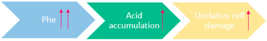 Schulpis et al. have shown that high levels of Phe damage the structure of DNA, proteins, lipids, and also lead to a decrease in antioxidant protection in the body [150,151]. Using the example of patients with phenylketonuria, damage to proteins and lipids was described by recording an increase in products such as carbonyl, oxidized sulfhydryl, the content of active forms of thiobarbituric acid, and malondialdehyde [18]. It was found that Phe metabolites, phenyllactic and phenylacetic acids have a significant effect on antioxidant enzymes (Figure 8). An increase in the content of superoxide dismutase in tissues was observed [152,153].