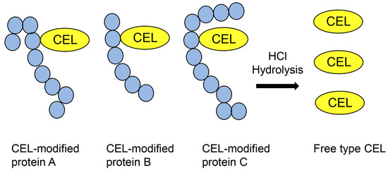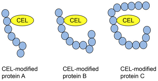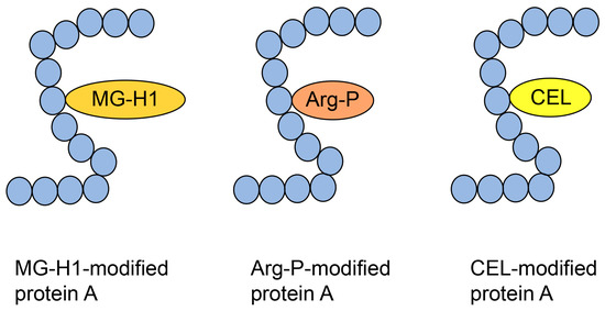 - Ikeda, K.; Higashi, T.; Sano, H.; Jinnouchi, Y.; Yoshida, M.; Araki, T.; Ueda, S.; Horiuchi, S. N (epsilon)–(carboxymethyl)lysine protein adducts is a major immunoglogical epitope in proteins modified with advanced glycation end products of Maillard reaction. Biochemistry 1996, 35, 8075–8083. [Google Scholar] [CrossRef]