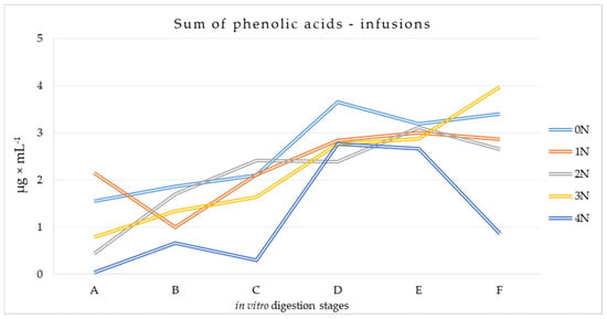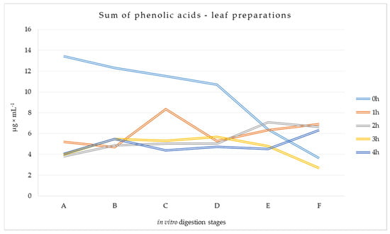 3.1.1. Phenolic Acid Content at Different Stages of Digestion of Leaf Preparations