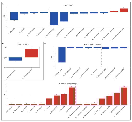 Differential fungi in the KO mice. Fungal taxa that are significantly (q, # ≤ 0.1, * ≤ 0.05, ** ≤ 0.01, and *** ≤ 0.001) differentially abundant in VDR KO mice relative to the control group, not sub-dividing by sex. “s_” indicates that the taxa is a species and “g_” indicates that it is a genus—the only two taxonomic levels that were studied. LFC indicates log2 fold change, and the color indicates the direction of the shift relative to the control (blue is decreased, and red is increased). (A) VDRΔPC, (B) VDRΔIEC, and (C) VDRΔLyz.
