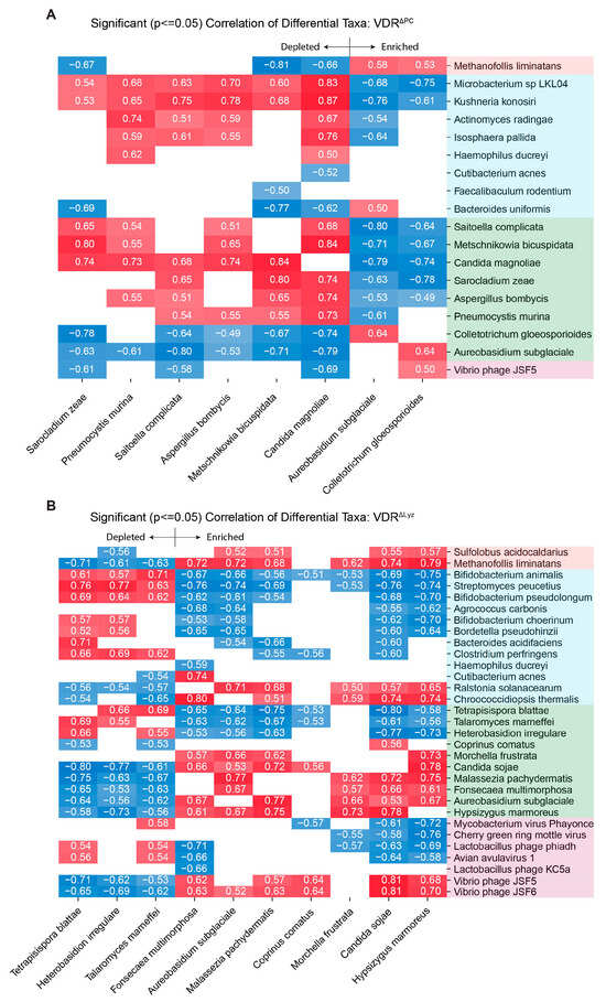 Significant (p ≤ 0.05) correlations between significantly differentially abundant (q ≤ 0.1) species of fungi and significantly differentially abundant (q ≤ 0.1) bacteria, archaea, and viruses. The cell color indicates the magnitude of the correlation (blue = negative; red = positive), while a white space indicates no significant correlation. The colors of the row names indicate the following: peach for archaea, blue for bacteria, green for eukaryotes, and purple for viruses. (A) VDRΔPC. (B) VDRΔLyz.
