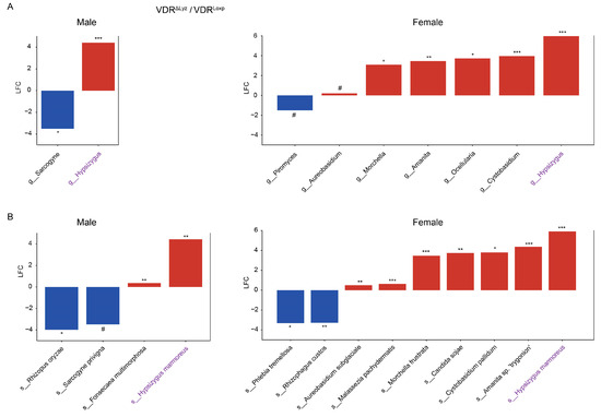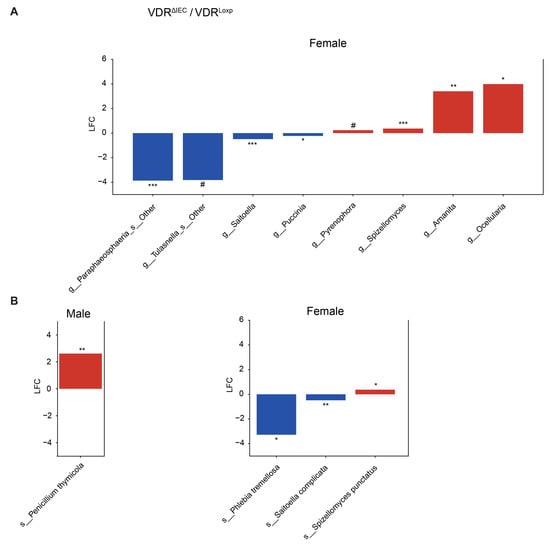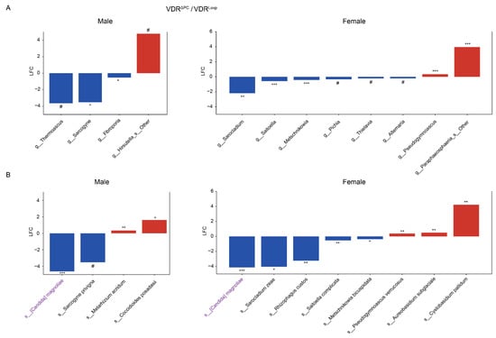 Differential fungi in sex subsets of the VDRΔPC group. Fungal taxa that are significantly (q # ≤ 0.1, * ≤ 0.05, ** ≤ 0.01, and *** ≤ 0.001) differentially abundant in the VDR knockout mice relative to the control mice via sex subset. Figure (A) shows the genera and figure (B) shows the species—the only two taxonomic levels that were observed. LFC indicates the log2 fold change, and the color indicates the direction of the shift relative to the control (blue is decreased, and red is increased). Purple font indicates that a taxa was found to be differentially abundant in both the male and female groups.