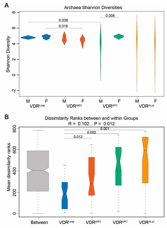 Species-level alpha and beta diversity in the VDR KO mice compared to the VDRLoxp control group. (A) Shannon diversity by sample. Presented are the p-values of the subsequent ANOSIM analysis on the sex subgroups that were statistically significant (p ≤ 0.05) or marginally significant (p ≤ 0.1). (B) Within-group versus between-group Bray–Curtis dissimilarity metrics for mice of both sexes. Color indicates genotype. A subsequent ANOSIM analysis found all the control–knockout pairs to be significantly different. These results, VDRΔIEC vs. VDRLoxp (p = 0.012), VDRΔPC vs. VDRLoxp (p = 0.002), and VDRΔLyz vs. VDRLoxp (p = 0.001), are indicated on the boxplot.