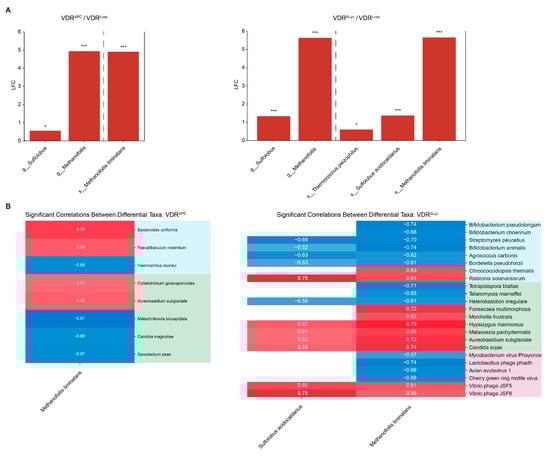 Differential archaea and their correlation maps. (A) Archaeal taxa that are significantly (q ≤ 0.1, * ≤ 0.05, and *** ≤ 0.001) differentially abundant in the VDR KO mice relative to the control group, not splitting by sex. “s_” indicates that the taxa is a species and “g_” indicates it is a genus—the only two taxonomic levels that were used as inputs. LFC indicates the log2 fold change, and the color indicates the direction of the shift relative to the control (blue is decreased, and red is increased). (B) Significant (p ≤ 0.05) correlations between significantly (q ≤ 0.1) differentially abundant species of archaea and significantly (q ≤ 0.1) differentially abundant bacteria, fungi, and viruses. The color indicates the magnitude of the correlation (blue = negative; red = positive), while a white space indicates no significant correlation. The colors of the row names indicate the following: peach for archaea, blue for bacteria, green for eukaryotes, and purple for viruses.