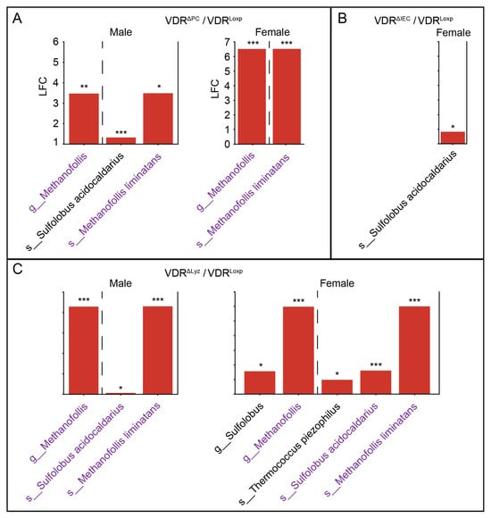 Differential archaea in sex subsets. Archaeal taxa that are significantly (q ≤ 0.1, * ≤ 0.05, ** ≤ 0.01, and *** ≤ 0.001) differentially abundant in VDR knockout mice. (A) VDRΔPC, (B) VDRΔIEC, and (C) VDRΔLyz in male and female mice. “s_” indicates that the taxa is a species and “g_” indicates that it is a genus—the only two taxonomic levels that were observed. LFC indicates the log2 fold change, and the color indicates the direction of the shift relative to the control (blue is decreased, and red is increased).