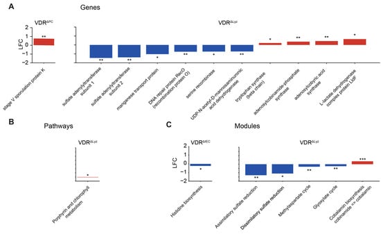 Predictive functional analysis using metagenomics. (A) Genes, (B) pathways, and (C) modules that are significantly (q ≤ 0.1, * ≤ 0.05, ** ≤ 0.01, and *** ≤ 0.001) increased in the KO vs. control mice. The magnitude of this difference is given as the log2 fold change (LFC), and the color indicates the direction of the shift relative to the control.