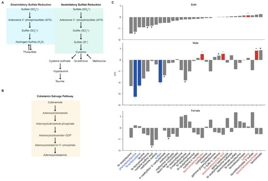 Metabolites related to sulfate reduction. (A) The primary metabolites involved in dissimilatory and sulfate reduction, along with key downstream molecules [62,63]. (B) The primary metabolites involved in the cobalamin salvage pathway [64]. (C) The difference in the abundances of metabolites from the above pathways detected in the VDRΔLyz mice relative to the VDRLoxp mice. LFC indicates the Log2 fold change. Gray indicates a lack of statistical significance (p ≤ 0.05), while the presence of a significant difference is given by non-gray color and * annotation. A # indicates marginal significance (p ≤ 0.1).