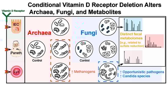 Disruption to the normal microbiome leads to an imbalance and increases susceptibility to further perturbations. This is why dysbiosis is often associated with pathology, for instance, drops in archaeal diversity like those seen here have been reported in obesity [65] and amyotrophic lateral sclerosis (ALS) [66], suggesting that this trend can either be a biomarker or a driver of an illness. Fungal dysbiosis is also common in disease states [67], likely due to the important impact that the mycobiome has on host immunity [68]. Different types of fungal dysbiosis have been linked to colorectal cancer (CRC) [69] and Crohn’s disease [70]. In most pathologic states (infection, inflammatory disease, etc.), a VDR deficiency is one of many factors contributing to pathogenesis [1,9,71]. Our model targets one specific gene in a tissue-specific manner and provides the evidence for host factors in shaping the microbiome and modulating the risk of diseases.
