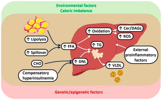| Environmental factors (e.g., diet) resulting in spillover of FFA from lipoproteins, or increased load of carbohydrates | ||