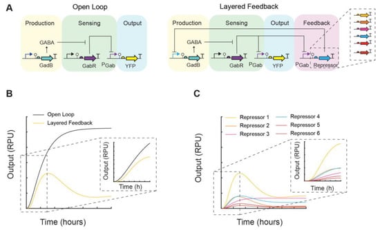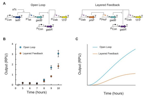 After constructing our EcN GABA production strain, we next sought to further engineer this strain to integrate dynamic regulation of GABA biosynthesis via synthetic regulatory networks. To compare circuit topologies, we constructed genetic circuits with open-loop control (identical to our inducible GABA biosynthesis system) and layered-feedback control, in which a negative feedback loop was created using a characterized repressor-based NOT gate, which acts as a transcriptional signal inverter (Figure 3A). In the latter design, the inducible promoter input expressing gadB (PTet) was replaced by the repressible promoter PPhlf, which is the output promoter of the PhlF NOT gate [22]. The expression of the PhlF repressor was placed under the control of PGab. In this way, the GABA sensor output feeds into the genetic circuit, which in turn regulates the expression of GadB and GABA biosynthesis, creating the closed-loop feedback. The GABA production of EcN cells transformed with the constructed plasmids was assayed in flasks using the conditions determined above and the GABA biosensor readout. We observed a slower rate of GABA production for cells containing the layered-feedback circuit compared to the open loop (Figure 3B). This is consistent with predictions obtained from our mathematical models (Figure 3C) and in agreement with similar feedback loops reported in the literature [17,18]. We observed detectable GABA production for both designs beginning 8 h after inoculation. While we also predicted a lower concentration of GABA at steady state for the layered-feedback control, this could not be confirmed experimentally here using this batch growth system, given that growth could not be extended beyond 10 h.
