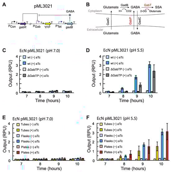 We next examined how the culturing vessel used for growth affects GABA production. Previously, the GABA biosensor was assayed in small-volume cultures using 96-well plates, which are commonly used for sensor characterization [25]. However, this presented challenges in this work, as there was an insufficient cell population to analyze multiple time points, and cultures had low cell densities. To test how scaling up affected GABA biosynthesis, we performed the GABA production assay for the EcN pML3021 production strain in 96-well plates, 14-mL culture tubes, and 125-mL Erlenmeyer flasks. In media at pH 7.0, we again observed insignificant GABA sensor activation and negligible GABA production for all growth vessels (Figure 2E). At pH 5.5, we observed GABA sensor activation beginning 8 h after GadB induction for cultures in plates, tubes, and flasks, and increasing activation through 10 h (Figure 2F). Due to the very fast growth rate of EcN, we could not continue culturing beyond 10 h and maintain exponential growth. When we used the GABA sensor response curves (Figure S1) to determine the GABA concentration produced, interestingly, the amount of GABA was comparable and statistically indistinguishable for all three vessels (Figure S3). However, the flask cultures had the highest reproducibility and lowest background GABA production without GadB induction. Therefore, we chose to use flask cultures in subsequent experiments.