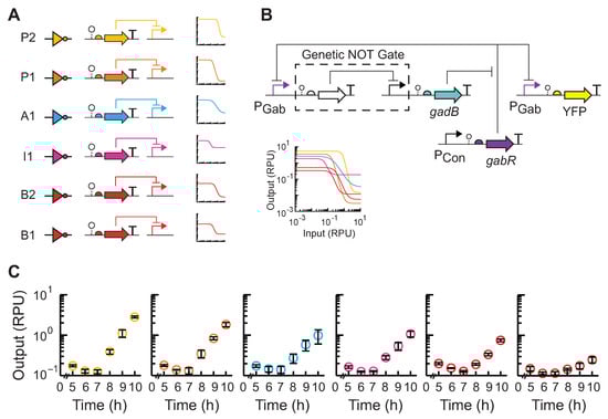 In the layered-feedback circuits, Qr is the output of the repressor NOT gate, as shown in Equation (6). In the case of the open-loop regulatory network, Qr was set to the maximum output of PTet, and equation 6 was set to zero. The value of μG is the output of PGab in the GABA sensor. The parameters α and β represent the production and degradation rate constants of their respective species. The degradation rate of mRNA, γ, has been set to 0.025 min−1 as in previous work [33]. A conversion factor ξ has been set to 0.025 [mRNA] min−1 RPU−1 with Qr = MQrξ−1γ [33]. The parameters ymin, ymax, K, and n are the values for the corresponding GABA sensor or NOT gate’s response function [23]. Equations were solved using the ode45 function in MATLAB. Lists of all parameters used are given in Tables S3 and S4.
