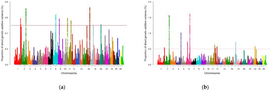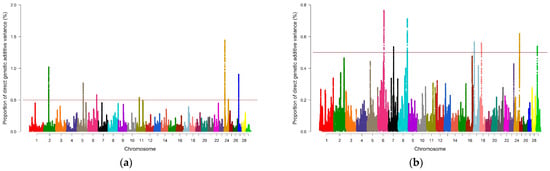 Manhattan plots of the posterior means of the percentages of genetic variance explained by each window of 1 Mb SNPs along the 29 autosomal chromosomes for the analyzed carcass quality traits: (a) rib eye area (REA); (b) subcutaneous fat thickness (SFT). Red lines indicate the threshold for considering significant SNP windows (0.5%). Colors indicate different chromosomes.
