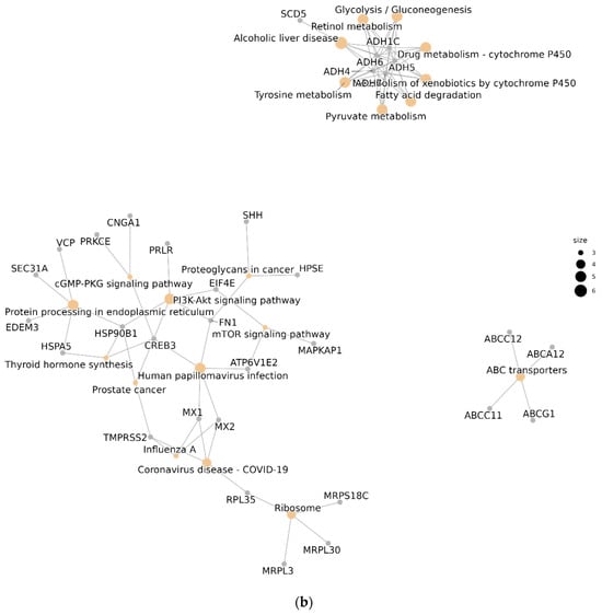 Network enrichment was performed for all phenotypes and indicated a set of ADH family genes modulating a large number of important pathways such as glycolysis, fatty acid degradation, pyruvate metabolism, and tyrosine metabolism. Another highlight is the ribosome pathway, which appears to be modulated by three genes from the same group called mitochondrial ribosomal proteins (MRP), which are ribosomal proteins important for the proper biogenesis of ribosomes []. In addition, genes such as HSP90B1 and HSPA5 are centrally located in the graph, indicating their participation in several pathways simultaneously (Figure 3), which can be explained by their function as molecular chaperones responsible for protein folding, assembly, translocation, and degradation in the stabilization of proteins and membranes [].