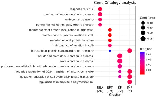GO enrichment analysis for biological processes (BPs). Comparative pathway analysis of REA, SFT, SF, and IMF groups. “GeneRatio” indicates the proportion of genes within a specific pathway relative to the total number of genes enriched (expressed as a fraction in parentheses beside the group name). The “P.adjust” value represents statistical significance, with smaller values depicted in red and larger values in blue. BP is indicative of the processes behind the gene function.