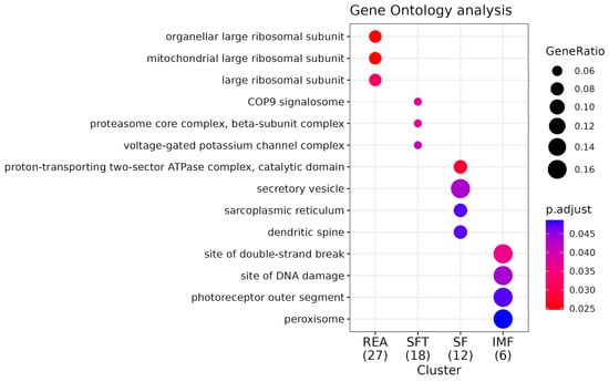 Among the CCs enriched for REA, the large ribosomal subunit stands out. Ribosomes are divided into two subunits: the small subunit and the large subunit. Each subunit has distinct ribosomal RNAs and associated ribosomal proteins (r-proteins); the small subunit is responsible for the interaction between mRNA codons and tRNA anticodons, while the large subunit contains the rRNAs that interact to create the actual peptidyl transferase site within the ribosome []. According to [], the study of ribosomal specialization is an emerging topic that highlights an absolutely new concept explaining the regulation of gene expression. Thus, finding such a CC in this study reinforces the thesis proposed by [] that ribosomes are an important regulator of the growth and maintenance of skeletal muscle, altering cells’ migratory capacity.