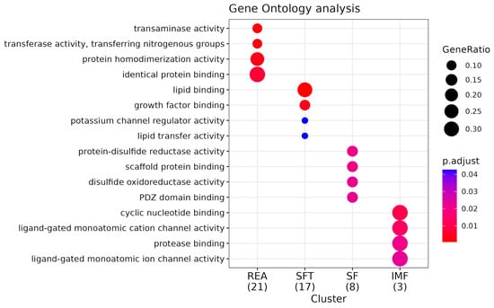 GO enrichment analysis for molecular function (MF). Comparative pathway analysis of REA, SFT, SF, and IMF Groups. “GeneRatio” indicates the proportion of genes within a specific pathway relative to the total number of genes enriched (expressed as a fraction in parentheses beside the group name). The “P.adjust” value represents statistical significance, with smaller values depicted in red and larger values in blue. Molecular functions are the actions of a product.