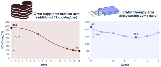 As the Oreo arm was designed to be only 2 weeks in duration, and included fewer time points than the statin arm, triplicate labs were collected on sequential days 14, 15, and 16 of the Oreo arm to confirm lipid changes and trends. Consistent Oreo consumption was maintained during that period; thus, the Oreo arm lasted 16 days in total.