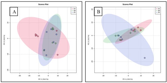 Principal component analysis (PCA) of meat (A) and subcutaneous fat; (B) metabolome of males programmed during gestation.