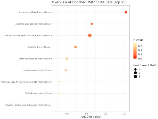 The aminoacyl–transporter RNA biosynthesis pathway was significant (p = 0.03) only for the metabolites present in meat from the functional enrichment analysis of metabolic concentration data using the Kyoto Encyclopedia of Genes and Genomes (KEGG) pathway (Figure 2). For the other processes, it was not possible to find a difference between the groups; even though the ratio of enrichment of the valine, leucine, and isoleucine biosynthesis pathway proved to be greater than the aminoacyl–tRNA biosynthesis, it was not enough to present a significant p value.