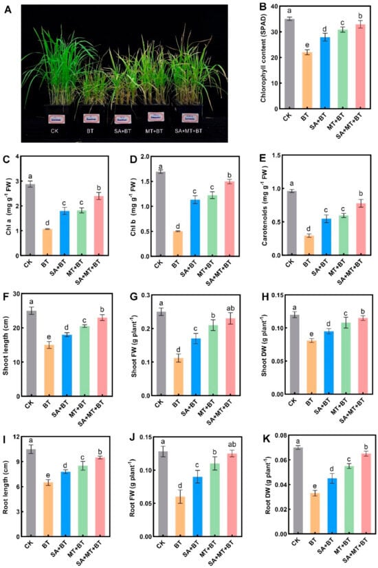 Impact of SA and MT on boron-induced alterations in rice seedling physiology and growth parameters. (A) Plant growth and treatment; (B–E) Changes in photosynthetic pigments; (F–K) Changes in plant biomass parameters such as length, fresh and dry weight. Data represents the mean of 3 replicates (n = 3), with vertical bars indicating the standard error (±SE). Dissimilar small alphabets on bar graphs denote significant differences between control and treatments (p ≤ 0.05).