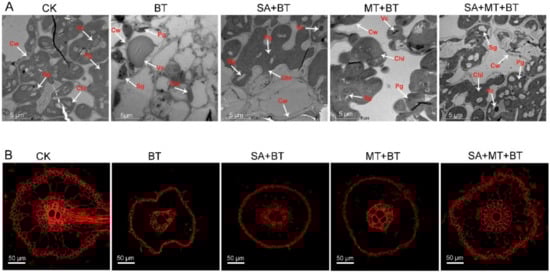 Impact of SA and MT on boron-induced changes in rice leaves chloroplast apparatus and root structure: (A) TEM and (B) confocal microscopic pictures of rice leaves and roots.