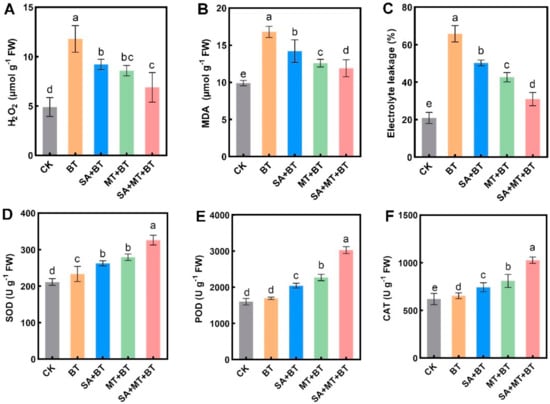 Impact of SA and MT on boron-induced changes in rice seedling physiological parameters: (A) H2O2 levels, (B) MDA levels, (C) electrolyte leakage, and (D–F) show antioxidant enzymes such as SOD, POD, and CAT. Data represent the mean of 3 replicates (n = 3) with vertical bars indicating ±SE. Dissimilar small alphabets on bar graphs denote significant differences between control and treatments (p ≤ 0.05).
