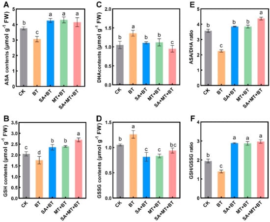Under boron toxicity, the concentrations of Ascorbate and Glutathione in rice seedlings were significantly decreased by 27.25% and 17.34%, respectively (Figure 4A,B). This reduction in essential antioxidants highlights the detrimental impact of boron on the plant’s oxidative balance. However, treatments with SA and MT, either individually or in combination, showed promising effects in mitigating these reductions compared to control plants. SA treatment alone increased AsA and GSH levels by 18.25% and 19.28%, respectively, compared to the control treatment (Figure 4A–D), demonstrating SA’s effectiveness in enhancing antioxidant capacity under stress. Moreover, the combined application of SA and MT further enhanced these parameters, with GSH levels increasing significantly by 32.41% compared to the controls (Figure 4A,B).