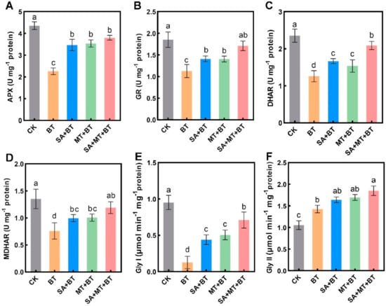 Impact of SA and MT on boron-induced changes in activities of enzymes involved in the Ascorbate–Glutathione (AsA–GSH) cycle and Glyoxalase system of rice plants: (A) Ascorbate Peroxidase (APX), (B) Glutathione Reductase (GR), (C) Dehydroascorbate Reductase (DHAR), (D) Monodehydroascorbate Reductase (MDHAR) and Glyoxalase I (Gly-I) (E) and Glyoxalase II (Gly-II) (F). Data represent the mean of 3 replicates (n = 3) with vertical bars indicating ±SE. Dissimilar small alphabets on bar graphs denote significant differences between control and treatments (p ≤ 0.05).