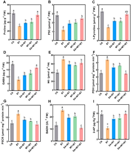 Impact of SA and MT on boron-induced changes in proline metabolism system in rice seedlings: (A) Proline content, (B) P5C content, (C) 1-pyrroline content, (D) GABA content and (E) methylglyoxal (MG). (F) PDH activity, (G) P5CR activity, (H) BADH activity, and (I) 2-AP content. Data represent the mean of 3 replicates (n = 3) with vertical bars indicating ±SE. Dissimilar small alphabets on bar graphs denote significant differences between control and treatments (p ≤ 0.05).
