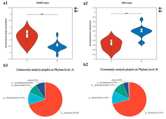 The gut microbiome health index (GMHI) of Group A was higher than that of Group B (p < 0.001, Cohen’s d = 2.04) (Figure 3(a1)). The microbial dysbiosis index (MDI) in Group B was higher than that in Group A (p < 0.001, Cohen’s d = 2.26) (Figure 3(a2)). At the phylum level, the community composition of the two groups is shown in Figure 3(b1,b2), where the Firmicutes/Bacteroidota (F/B) ratio in Group A was higher than in Group B.