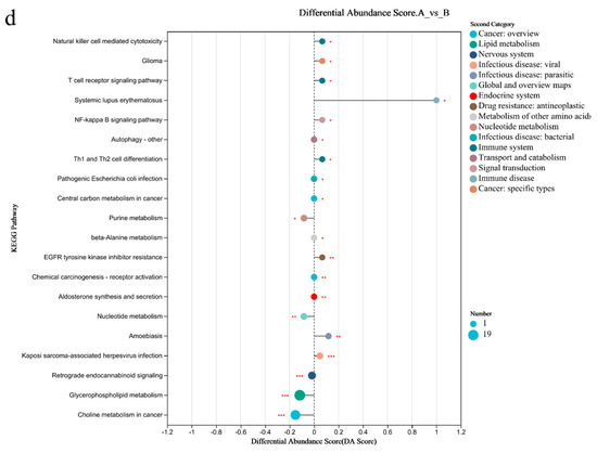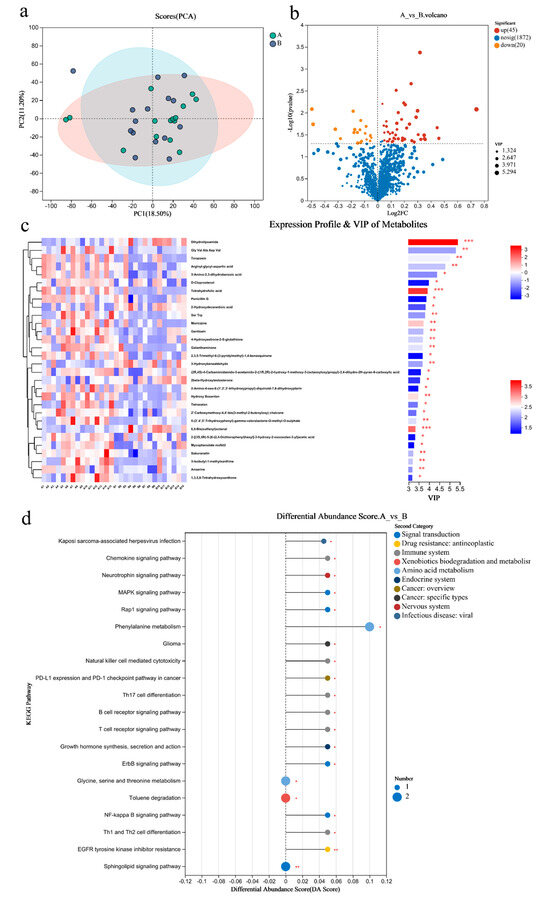 Differential metabolites of the gut microbiome of sprinters and their enriched pathways (n = 15). (a) The principal component analysis (PCA); (b) the volcano plot of differential metabolites; (c) the variable importance in the projection (VIP) analysis chart; (d) the differential abundance score plot of the KEGG pathway. Compared with Group A, * p < 0.05, ** p < 0.01, *** p < 0.001.