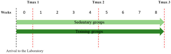 Study design. Tmax: Maximum speed performance on a treadmill. Tmax1; after one week of familiarization (week 0—adaptation), Tmax2; after 4 weeks of training, and Tmax3; after 8 weeks of training.