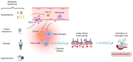 Mechanisms of metabolic syndrome, insulin resistance, and dyslipidemia on neuroinflammation. The combination of insulin resistance and dyslipidemia may lead to vascular damage, which promotes the formation and progression of atherosclerosis and contributes to systemic low-grade inflammation. Peripheral inflammatory mediators can cross the leaky blood–brain barrier, activating microglial cells in the brain. This activation results in neuroinflammation and disrupts the synthesis, transport, and metabolism of neurotransmitters involved in mood regulation, such as serotonin, dopamine, norepinephrine, and glutamate, thereby increasing the risk of mental disorders. Abbreviations: ROS, reactive oxygen species; LDL-C, low-density lipoprotein cholesterol; LDLox, oxidized low-density lipoprotein. Created with BioRender.com.
