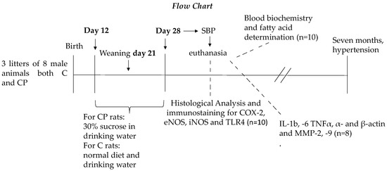 A group of rats was given 30% sucrose in their drinking water during the CP of vessel development (postnatal days 12 to 28); the control (C) group received a normal diet and drinking water. The animals in both groups were of the same age. Pups from 8 gestating mother rats were used. The litters were adjusted to 8 male pups per mother from the moment of birth, and each mother was housed in a separate cage. The mothers were fed Purina 5001 rat chow (Richmond, IN, USA) ad libitum and were kept under controlled temperatures and a 12:12-h light-dark cycle. Pups were fed milk from their mothers on the first days of the CP, and then were fed a mixture of milk and rat chow until weaning. Pups were separated from the mothers on postnatal day 21, and from that day on, they were only fed rat chow. The 8 neonatal rats from each litter were kept in independent cages. Rats from at least 3 litters of 6 male animals for the C and CP groups were used for pressure measurement, and other rats from at least 3 litters of 8 male animals for the CP and C groups were used for serum and tissue determinations. All pups were sacrificed on postnatal day 28. Figure 1 shows the flow chart for the proposed study.