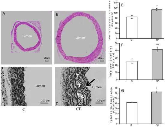 The closeups showed differences in the structure of the aortic wall between the C group and CP, distinguished in more detail (Figure 2A–D). A defined and organized structure of the aortic wall was identified in the controls. In contrast, the structure of the aortic wall of the CP aortas presented disorganization, wavy EF (1.8%) without reaching a statistically significant difference, and alterations in the smooth muscle, in which decellularization and aneurysms were observed, mainly in the central part of the media. The values of total lumen area, total area and aortic wall thickness are greater in the CP group when compared to control group (Figure 2E–G, respectively).