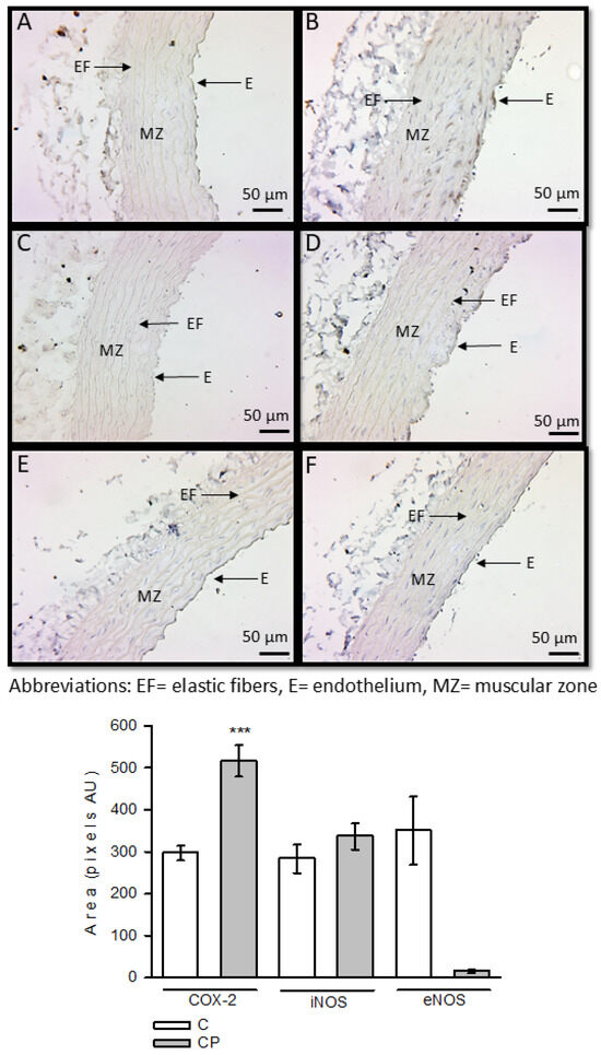 Immunohistochemistry for COX-2, iNOS, and eNOS in control aortas and aortas from rats that received sucrose during the CP. Panels (A,C,E) (COX-2, iNOS, and eNOS in the C group, respectively) and panels (B,D,F) (COX-2, iNOS and eNOS in the CP group, respectively). *** p < 0.001. Values represent the mean ± SE, n = 10, per group. Abbreviations: EF = elastic fibers, E = endothelium, MZ = muscular zone.