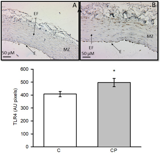 Expression of TLR4 was elevated in aortas from CP rats with a statistically significant difference (p < 0.03, Figure 4).