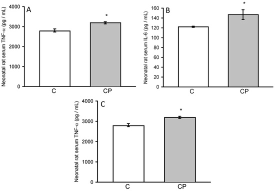 Concentrations of interleukins IL-1β (A), IL-6 (B), and TNF-α (C) in serum from control and CP rats.. Values represent the mean ± SE (n = 8 per group), * p < 0.05.