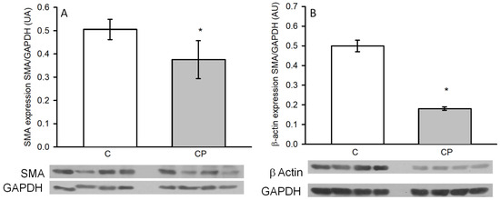 Changes in the expression of SMA (A) and β-actin (B) in thoracic aortas from C rats and CP rats. Values represent the mean ± SE (n = 8 animals per group). * p < 0.05. Representative western blot images are included in the lower panel. AU refers to arbitrary units, which are determined as the relative density of the band of the protein of interest in relation to the control of charge protein (GAPDH).