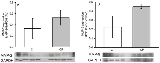 The expressions of MMP-2 (A) and -9 (B), which are involved in the remodeling of arteries during the development of hypertension, through the breakage of the fibrous material surrounding the cells, tended to be elevated in aortas from CP rats in comparison to those of the control rats without reaching a statistically significant difference (Figure 7).