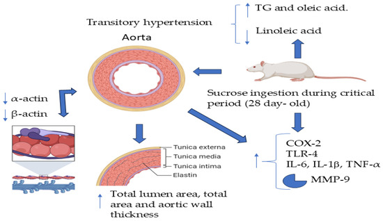 Excess consumption of sucrose in drinking water during the CP of vessel development in rats results in transitory hypertension accompanied by a change in the phenotype of VSMCs to the secretory type. There is a decrease in smooth muscle of β- and α-actin, which could act as an epigenetic cue to determine the development of hypertension when the animals reach adulthood. This change in the phenotype might be induced by increased inflammation characterized by increased levels of TNF-α, IL-6, and an increase in the expression of COX-2, TLR-4, and MMP-9, arrow-up = increase, arrow-down= decrease.