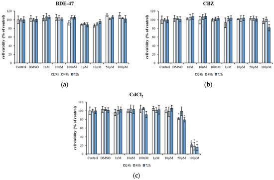 Cytotoxicity of HepG2 cells exposed to different concentrations of BDE 47 (1 nM–100 µM) (a), CBZ (1 nM–100 µM) (b), and CdCl2 (1 nM–100 µM) (c) for 24 h, 48 h, and 72 h. Bars represent the mean ± SEM (n = 6). Statistical differences (p < 0.05) between groups compared to control are indicated by “*”. BDE-47: polybrominated diphenyl ether 47, CdCl2: cadmium chloride, CBZ: carbamazepine.