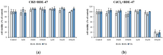 The next step was to investigate the effects of a mixture of two compounds on HepG2 cell viability. The cells were exposed to increasing concentrations of CBZ (from 1 nM to 100 µM) (Figure 2a) and CdCl2 (from 1 nM to 100 µM) (Figure 2b) mixed with 1 µM BDE-47 for 72 h. No significant reduction in cell viability was observed at different concentrations and times (Figure 2a,b). The highest dose (100 µM) of the CdCl2 + BDE-47 mixture demonstrated significant toxicity after 24 h (20.99 ± 4.74% of viability; p < 0.05), 48 h (12.14 ± 3.22% of viability; p < 0.05), and 72 h (18.80 ± 6.22% of viability; p < 0.05) of treatment (Figure 2b) compared to untreated cells.