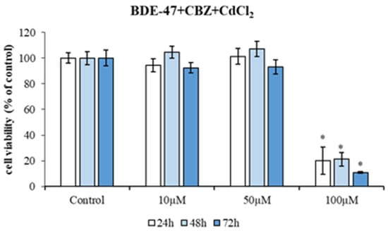 After the selection of appropriate contaminant doses, HepG2 cells were exposed to increasing concentrations of mixtures of the three compounds: BDE-47 (10 μM) + CBZ (10, 50, and 100 μM) and CdCl2 (10, 50, and 100 μM), for a period of 72 h (Figure 3). The cells exposed to the mixture of three compounds exhibited a markedly diminished viability with the highest dose (100 µM) at 24 h (20.13 ± 10.69% of viability; p < 0.05), 48 h (21.22 ± 5.34% of viability; p < 0.05), and 72 h (10.80 ± 0.60% of viability; p < 0.05) of treatment (Figure 3).