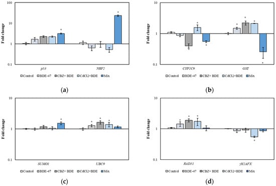Relative expression of genes related to cell cycle (p53) and oxidative stress (NRF2) (a), detoxification process (CYP2C9 and GST) (b), SUMOylation processes (SUMO1 and UBC9) (c), and DNA damage repair process (RAD51 and γH2AFX) (d) in HepG2 cells exposed to vehicle (Control), 1 μM of BDE-47 (BDE-47), 1 µM di BDE 47 + 10 μM of CBZ (CBZ + BDE), 10 μM of CdCl2 + 1 µM di BDE 47 (CdCl2 +BDE), and a mixture of contaminants (1 μM of BDE-47+ 10 µM CBZ +10 µM CdCl2) (Mix) for 72 h. Statistical differences (p < 0.05) between groups compared to control are indicated by “*”. BDE-47: polybrominated diphenyl ether 47, CdCl2: cadmium chloride, CBZ: carbamazepine.