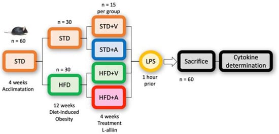 On this basis, here, we have developed an experimental model to simulate two situations: health and chronic low-grade inflammation that occurs in obese individuals. Both are confronted with an acute inflammation-inducing challenge through the i.p. administration of LPS, mimicking an acute bacterial infection, to study the effect of L-alliin on the serum levels of cytokines when present in diet-induced obesity (DIO) or normally fed mice.