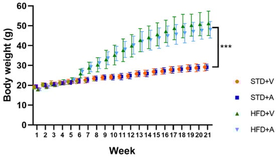 Body weight of male C57BL/6J mice fed a standard diet (STD) or a high-fat diet (HFD) and alliin (A) or vehicle (V) (n = 15 in each group), recorded over 21 weeks. Mean and standard deviation (SD) are shown. *** p < 0.001.