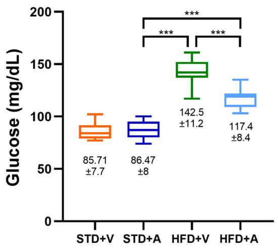 Glucose serum levels at the end of the L-Alliin treatment (at 20 weeks of age) of male C57BL/6J mice fed a standard diet (STD) or a high-fat diet (HFD) and alliin (A) or vehicle (V) (n = 15 in each group), recorded at 21 weeks of age. Mean values and standard deviations (SD) are shown. *** p < 0.001.